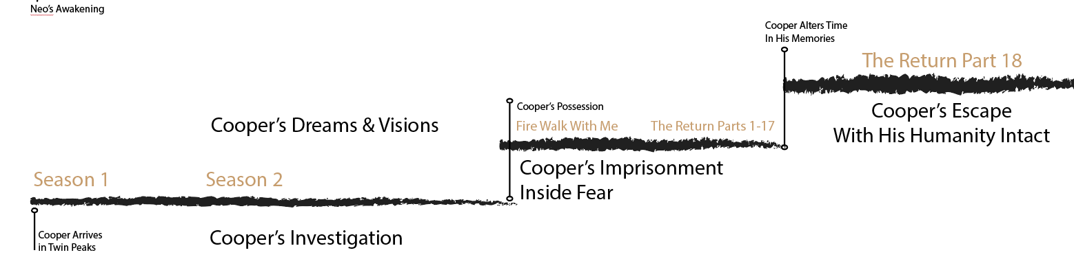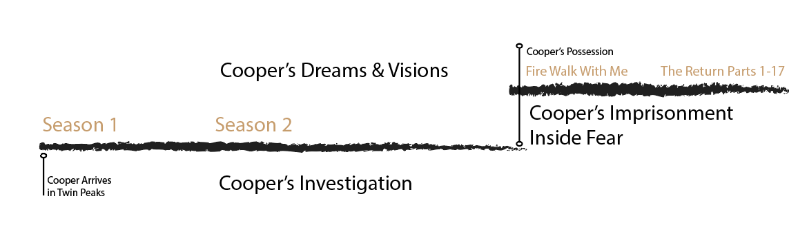 Special Agent Dale Cooper rolls into Twin Peaks with the full force of his faculties of observation and deduction, along with his strong power of intuition. First, Cooper becomes enamored with the people, town, and spirits that inhabit the woods around Twin Peaks. Next, he engages in an investigation that begins to mingle with his dreams. Eventually, his dreams invade his reality, and he becomes locked in place, struggling against impossible odds to retain his humanity while his soul is under assault by a force of extreme negative energy without mercy.