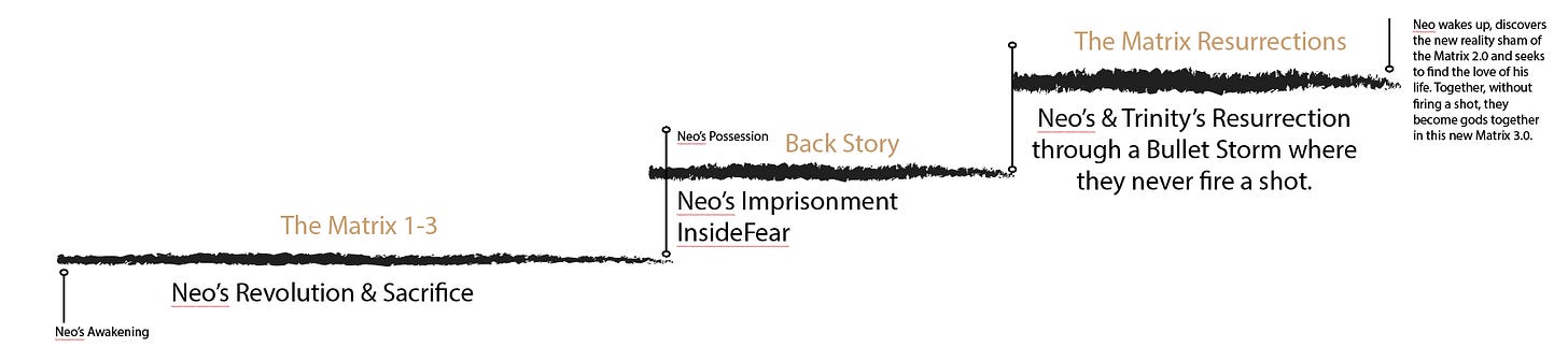 Neo falls in love with Trinity and, through that love, agrees to help wake as many human beings as possible so they can join in a final battle against the machines. But Neo’s revolution fails, or at least it doesn’t go down the way they plan, and he and Trinity lose their lives in a glorious sacrifice at the end of the original Matrix Trilogy.